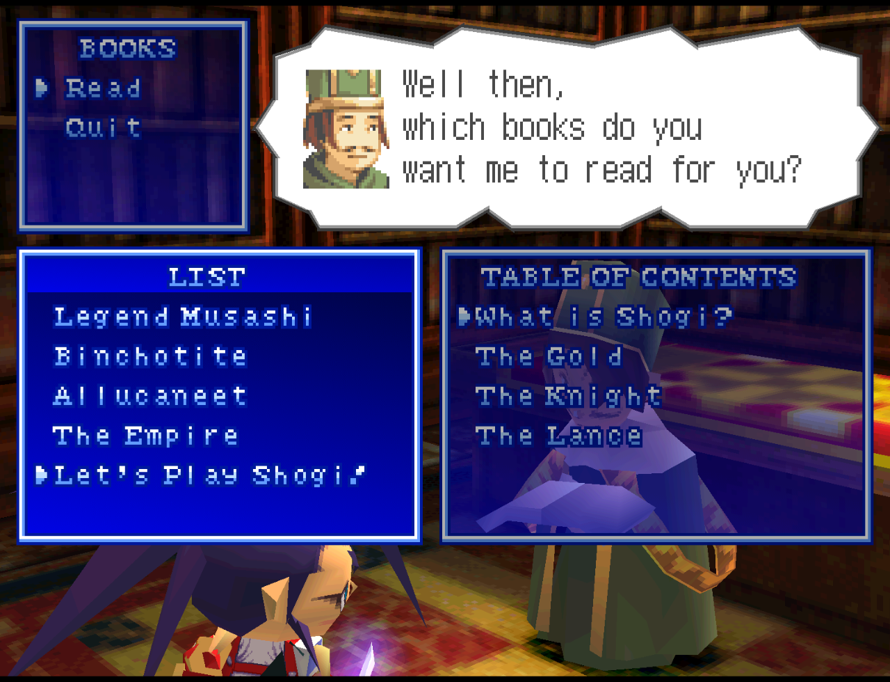 As of March 31st, at time of writing, I have not gotten very far in Brave Fencer Musashi. The game is older than I remember, and its age shows in a lot of little places that make playing feel a bit more trudging than it probably should, but that isn’t the reason I’ve stopped playing. I have, over several instances, paused my slow-going progress to return to the castle, menu-hop my way over to the library, and take a deep breath and commit to reading the first chapter of Let’s Play Shoji.